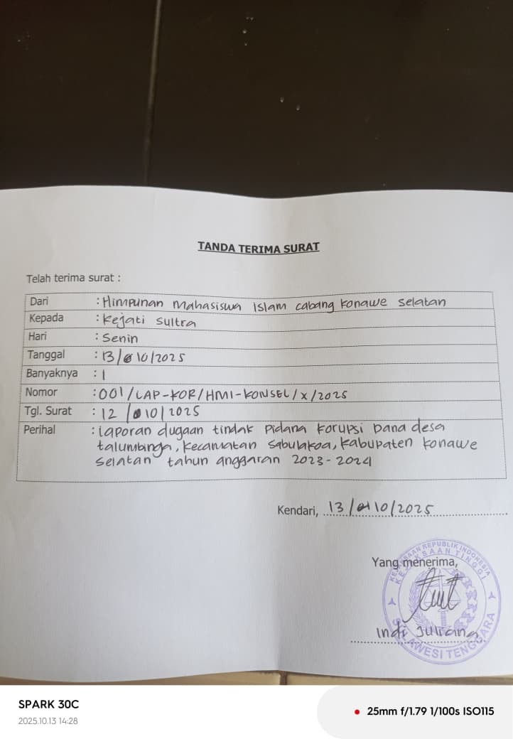 Ketua Umum Himpunan Mahasiswa Islam (HMI) Cabang Konawe Selatan, Indra Dapa, yang bertindak sebagai pelapor, menegaskan bahwa pihaknya telah melayangkan laporan resmi ke Kejaksaan Tinggi Sulawesi Tenggara (Kejati Sultra) terkait dugaan penyimpangan Dana Desa Talumbinga.