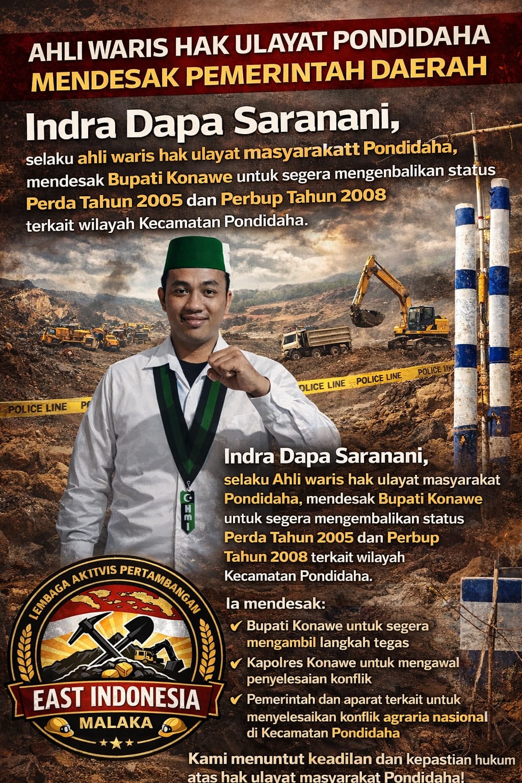Konawe — Lembaga Aktivis Pertambangan East Indonesia Malaka secara tegas mendesak Bupati Konawe dan Kapolres Konawe untuk segera mengambil langkah konkret dalam menyelesaikan persoalan tapal batas antara Kecamatan Pondidaha dan Kecamatan Amongedo.