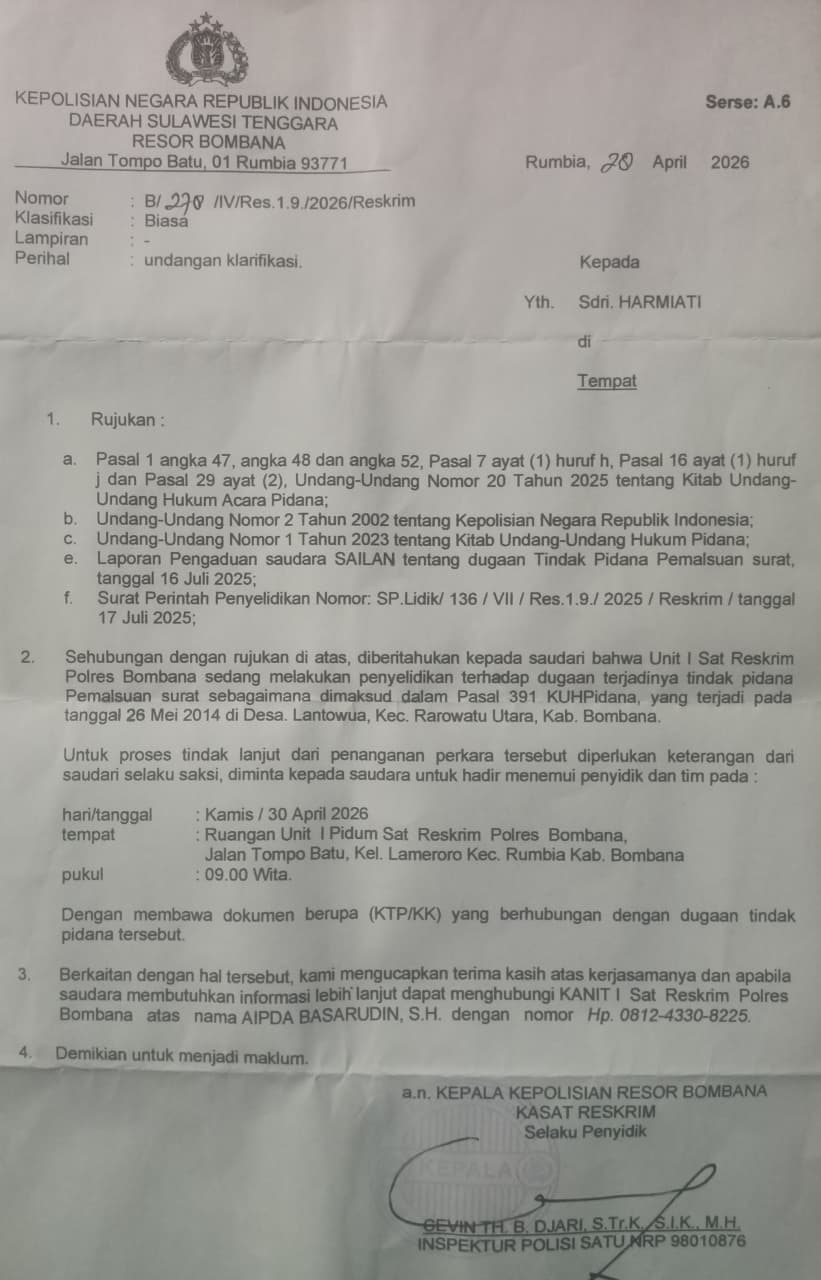 Kami memiliki dokumen yang kuat. Jika mediasi tidak membuahkan hasil, kami siap mengawal kasus ini hingga ke meja hijau demi tegaknya keadilan di Bumi Bombana,”tutup Ketua Umum PERAK SULTRA.